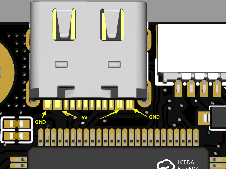 USB接口焊接完成后,请确认5V和GND没有短路(内侧两个是5V,外侧两个是GND)