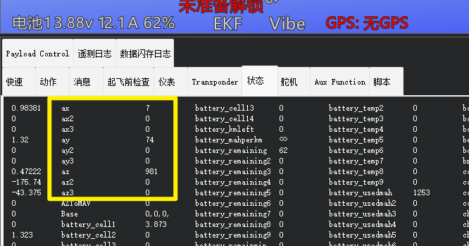 异常的如下图所示,只有ax、ay、az有数据。(正常ax2、ay2、az2也要有数据)