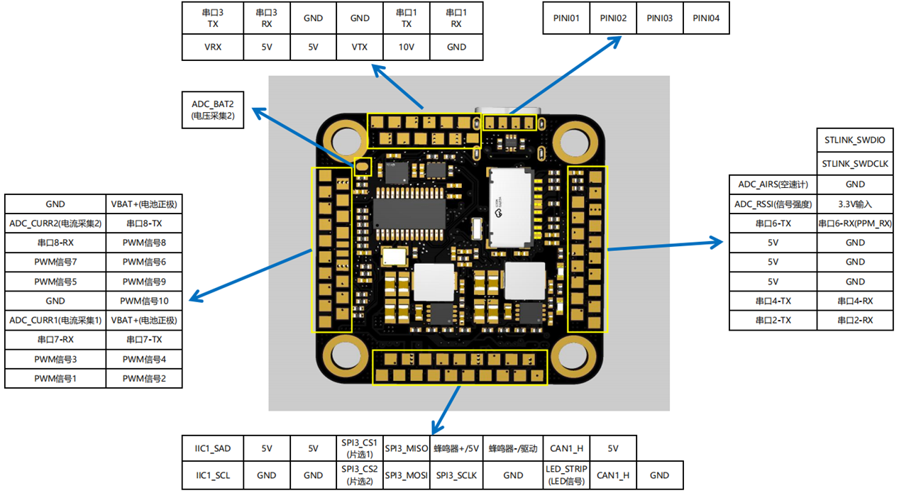 | SH1.0对外接口 | ELRS/SBUS接收机接口 X 1个、模拟摄像头接口 X 1个、模拟图传接口 X 1个、电调信号输出1 X 1个(BAT+,GND,CUR1,U7-RX,S4,S3,S2,S1)、电调信号输出2 X 1个(BAT+,GND,CUR2,U8-RX,S8,S7,S5,S6)、GPS接口 X 1个、高清图传接口 X 1个、CAN接口 X 1个、SPI接口 X 1个、IIC接口 X 1个、注:上述接口均全部引至底面焊盘,详见焊盘定义图。 |