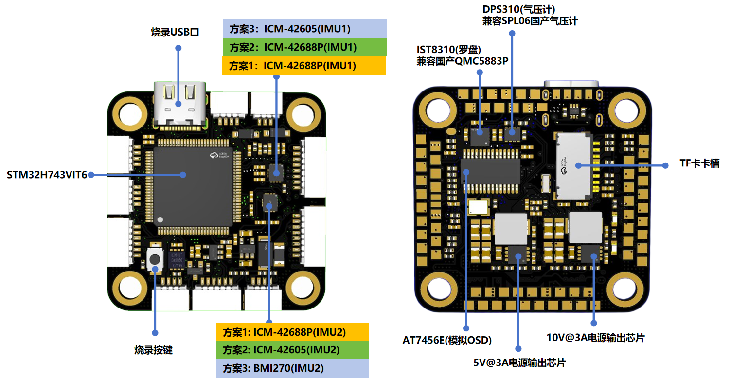 | 核心传感器组合 | 板载IMU×2颗,支持以下3种组合:IMU组合1:双ICM-42688PIMU组合2:ICM-42688P(IMU1)、 ICM-42605(IMU2)IMU组合3:ICM-42605(IMU1)、BMI270(IMU2)板载气压计 DPS310 (已兼容SPL06气压计)板载罗盘IST8310(已兼容QMC5883P罗盘)淘宝小店售卖的飞控为V3版,其传感器型号如下:ICM-42605(IMU1)、BMI270(IMU2)、SPL06、QMC5883P |