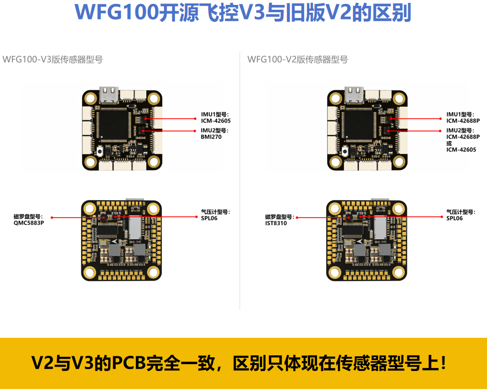 • V2版本硬件:ICM42688P(imu1) + ICM42688P/ICM42605(imu2) + SPL06(气压计) + IST8310(罗盘)