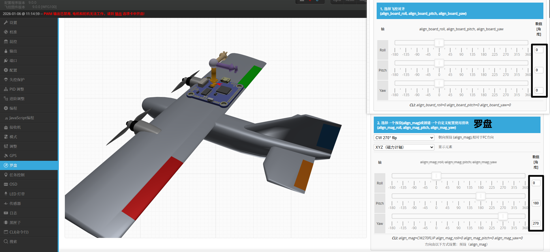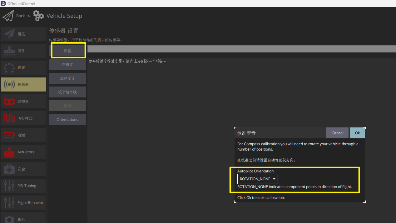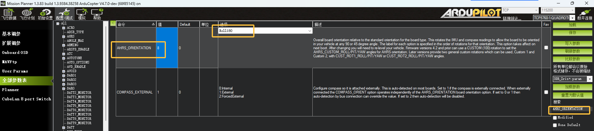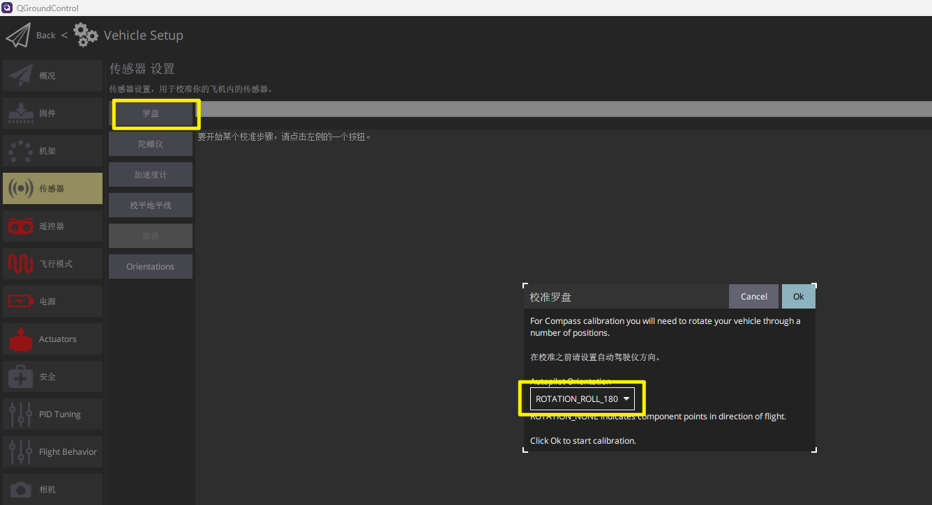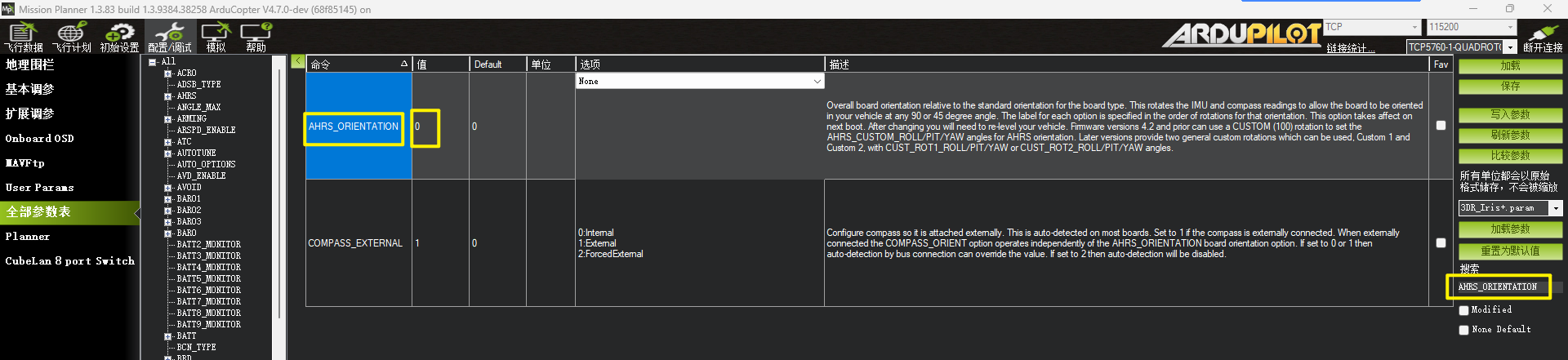 注:在AP固件中,调整航姿方向后,内置罗盘的方向会自动调整,因此无需单独调整内置罗盘的朝向!