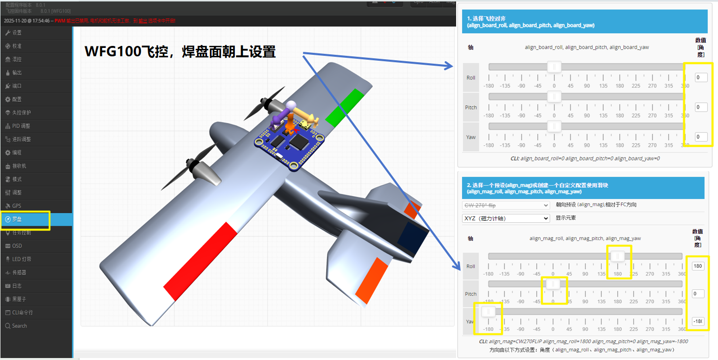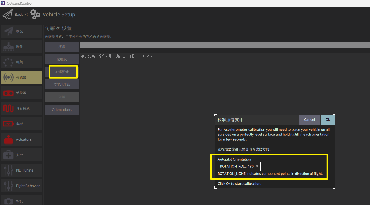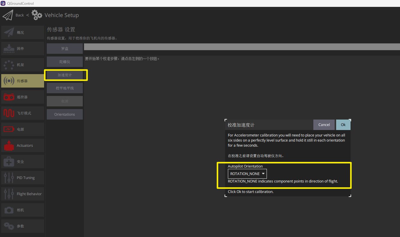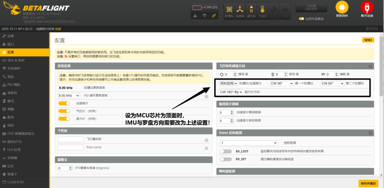 注:在AP固件中,调整航姿方向后,内置罗盘的方向会自动调整,因此无需单独调整内置罗盘的朝向!