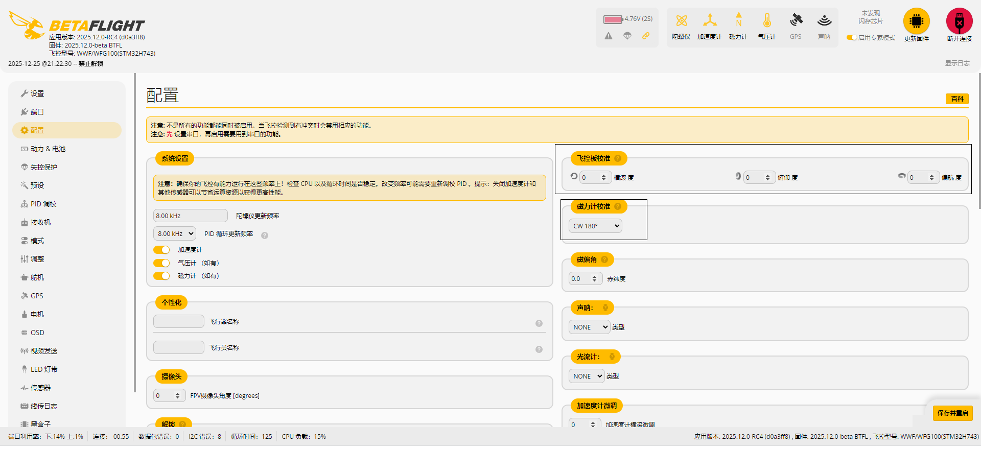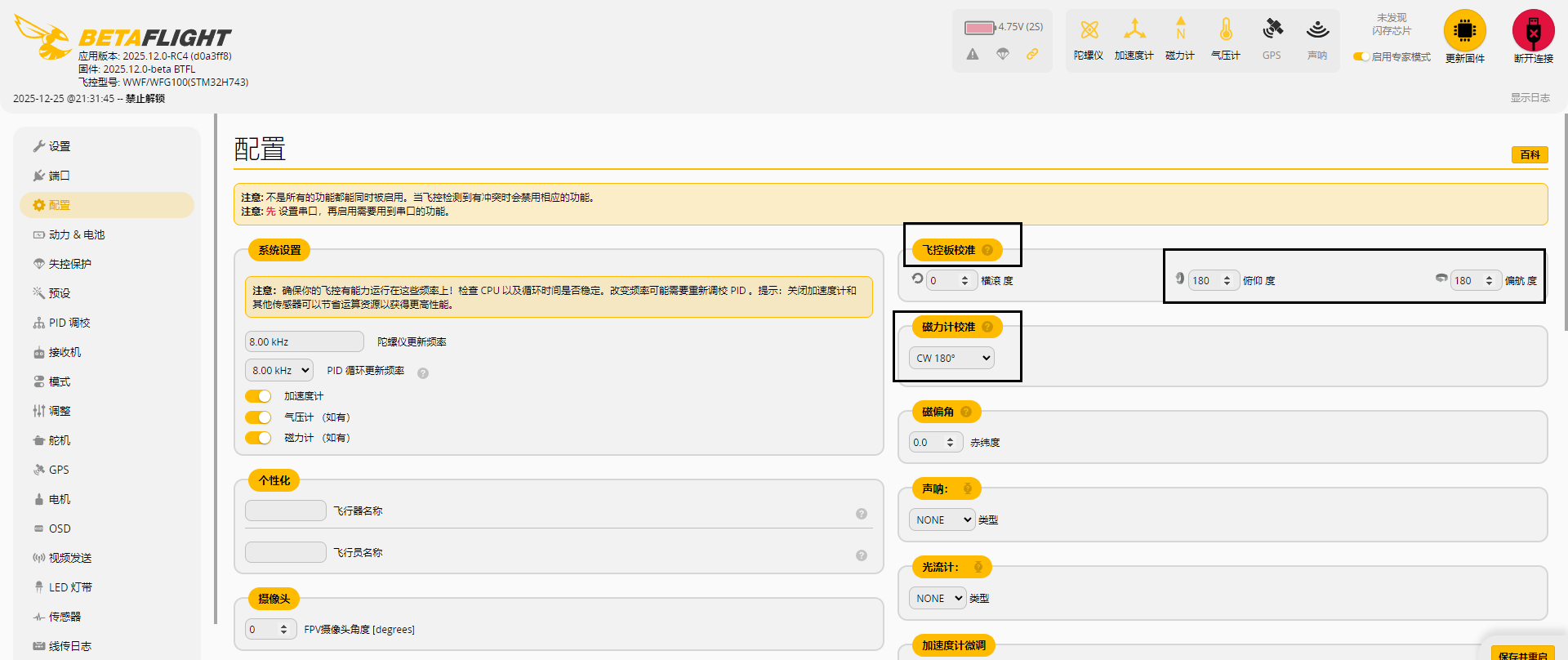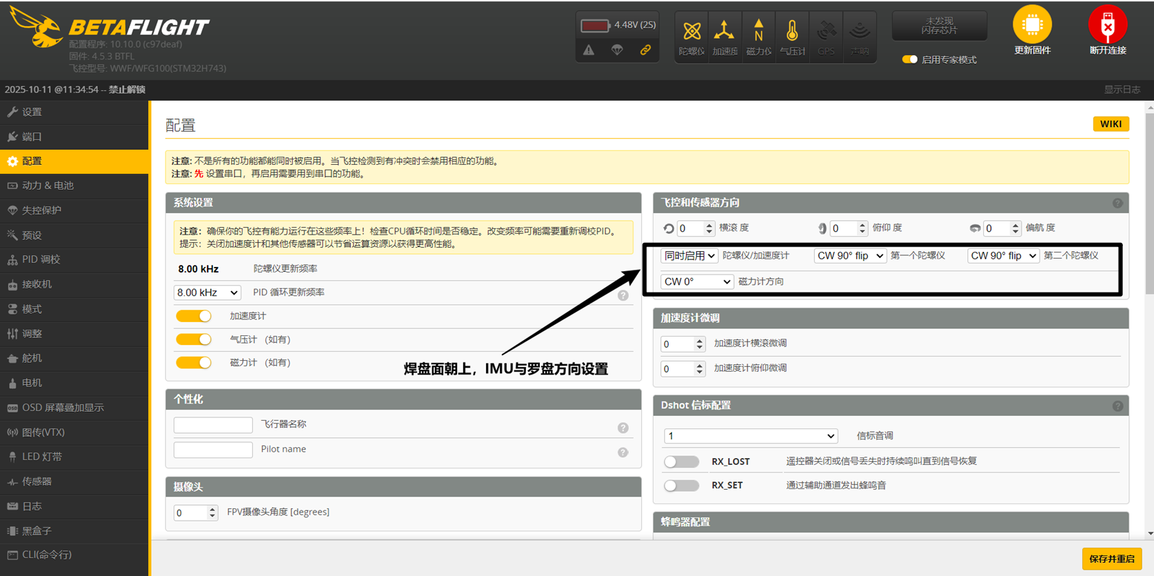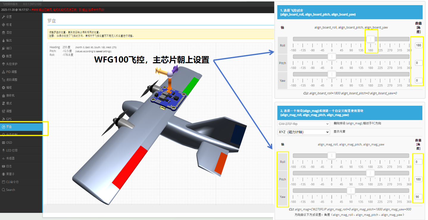 注:在AP固件中,调整航姿方向后,内置罗盘的方向会自动调整,因此无需单独调整内置罗盘的朝向!